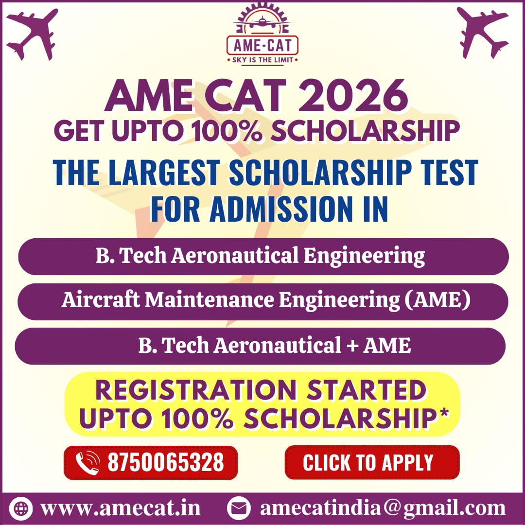 PARTICIPATE IN LARGEST SCHOLARSHIP TEST AME CAT 2026 FOR ADMISSION IN AIRCRAFT MAINTENANCE ENGINEERING (AME), AERONAUTICAL ENGINEERING, ETC. CLICK HERE TO APPLY